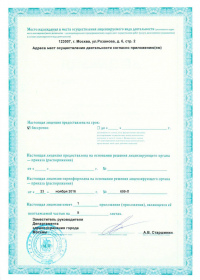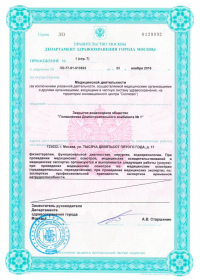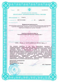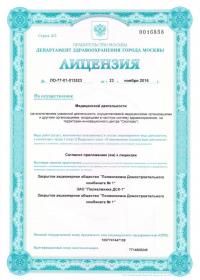 | Лицензии | 28.12.2016 Номер лицензии: ЛО-77-01-013720 Лицензируемый вид деятельности: Медицинская деятельность Дата внесения записи в реестр: 28.12.2016 Номер приказа о предоставлении лицензии: 776-Л Дата приказа о предоставлении лицензии: 28.12.2016 Адрес мест осуществления лицензируемого вида деятельности: 123007, г. Москва, 3-й Хорошевский пр., д. 3 А, стр. 32 |