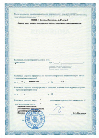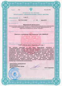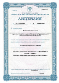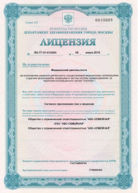 | Лицензии | 27.02.2020 Номер лицензии: ЛО-50-01-011792 Лицензируемый вид деятельности: Медицинская деятельность Дата внесения записи в реестр: 27.02.2020 Номер приказа о предоставлении лицензии: 159-УЛ Дата приказа о предоставлении лицензии: 27.02.2020 Адрес мест осуществления лицензируемого вида деятельности: 101000, г. Москва, Чистопрудный б-р, д. 12, корп. 2 22.08.2019 Номер лицензии: ЛО-50-01-011202 Лицензируемый вид деятельности: Медицинская деятельность Дата внесения записи в реестр: 22.08.2019 Номер приказа о предоставлении лицензии: 626-УЛ Дата приказа о предоставлении лицензии: 22.08.2019 Адрес мест осуществления лицензируемого вида деятельности: 119331, г. Москва, проспект Вернадского, д. 33 27.11.2018 Номер лицензии: ЛО-77-02-009867 Лицензируемый вид деятельности: Фармацевтическая деятельность Дата внесения записи в реестр: 27.11.2018 Номер приказа о предоставлении лицензии: 899-Л Дата приказа о предоставлении лицензии: 27.11.2018 Адрес мест осуществления лицензируемого вида деятельности: 119192, г. Москва, ул. Столетова, д. 19 14.12.2006 Номер лицензии: 77-01-001681 Лицензируемый вид деятельности: Медицинская деятельность Дата внесения записи в реестр: 14.12.2006 Номер приказа о предоставлении лицензии: Дата приказа о предоставлении лицензии: Адрес мест осуществления лицензируемого вида деятельности: 101000, г. Москва, Чистопрудный бульвар, д. 12, корп. 2 |