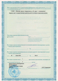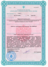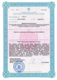 | Лицензии | 27.02.2020 Номер лицензии: ЛО-50-01-011792 Лицензируемый вид деятельности: Медицинская деятельность Дата внесения записи в реестр: 27.02.2020 Номер приказа о предоставлении лицензии: 159-УЛ Дата приказа о предоставлении лицензии: 27.02.2020 Адрес мест осуществления лицензируемого вида деятельности: 101000, г. Москва, Чистопрудный б-р, д. 12, корп. 2 22.08.2019 Номер лицензии: ЛО-50-01-011202 Лицензируемый вид деятельности: Медицинская деятельность Дата внесения записи в реестр: 22.08.2019 Номер приказа о предоставлении лицензии: 626-УЛ Дата приказа о предоставлении лицензии: 22.08.2019 Адрес мест осуществления лицензируемого вида деятельности: 119331, г. Москва, проспект Вернадского, д. 33 27.11.2018 Номер лицензии: ЛО-77-02-009867 Лицензируемый вид деятельности: Фармацевтическая деятельность Дата внесения записи в реестр: 27.11.2018 Номер приказа о предоставлении лицензии: 899-Л Дата приказа о предоставлении лицензии: 27.11.2018 Адрес мест осуществления лицензируемого вида деятельности: 119192, г. Москва, ул. Столетова, д. 19 14.12.2006 Номер лицензии: 77-01-001681 Лицензируемый вид деятельности: Медицинская деятельность Дата внесения записи в реестр: 14.12.2006 Номер приказа о предоставлении лицензии: Дата приказа о предоставлении лицензии: Адрес мест осуществления лицензируемого вида деятельности: 101000, г. Москва, Чистопрудный бульвар, д. 12, корп. 2 |