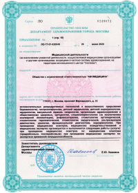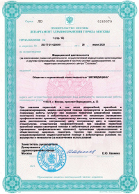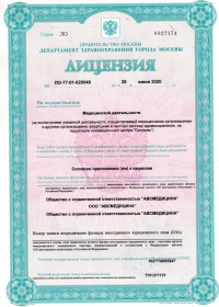 | Лицензии | 27.02.2020 Номер лицензии: ЛО-50-01-011792 Лицензируемый вид деятельности: Медицинская деятельность Дата внесения записи в реестр: 27.02.2020 Номер приказа о предоставлении лицензии: 159-УЛ Дата приказа о предоставлении лицензии: 27.02.2020 Адрес мест осуществления лицензируемого вида деятельности: 101000, г. Москва, Чистопрудный б-р, д. 12, корп. 2 22.08.2019 Номер лицензии: ЛО-50-01-011202 Лицензируемый вид деятельности: Медицинская деятельность Дата внесения записи в реестр: 22.08.2019 Номер приказа о предоставлении лицензии: 626-УЛ Дата приказа о предоставлении лицензии: 22.08.2019 Адрес мест осуществления лицензируемого вида деятельности: 119331, г. Москва, проспект Вернадского, д. 33 27.11.2018 Номер лицензии: ЛО-77-02-009867 Лицензируемый вид деятельности: Фармацевтическая деятельность Дата внесения записи в реестр: 27.11.2018 Номер приказа о предоставлении лицензии: 899-Л Дата приказа о предоставлении лицензии: 27.11.2018 Адрес мест осуществления лицензируемого вида деятельности: 119192, г. Москва, ул. Столетова, д. 19 14.12.2006 Номер лицензии: 77-01-001681 Лицензируемый вид деятельности: Медицинская деятельность Дата внесения записи в реестр: 14.12.2006 Номер приказа о предоставлении лицензии: Дата приказа о предоставлении лицензии: Адрес мест осуществления лицензируемого вида деятельности: 101000, г. Москва, Чистопрудный бульвар, д. 12, корп. 2 |