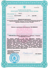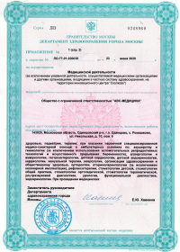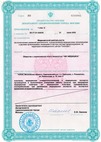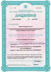 | Лицензии | 27.02.2020 Номер лицензии: ЛО-50-01-011792 Лицензируемый вид деятельности: Медицинская деятельность Дата внесения записи в реестр: 27.02.2020 Номер приказа о предоставлении лицензии: 159-УЛ Дата приказа о предоставлении лицензии: 27.02.2020 Адрес мест осуществления лицензируемого вида деятельности: 101000, г. Москва, Чистопрудный б-р, д. 12, корп. 2 22.08.2019 Номер лицензии: ЛО-50-01-011202 Лицензируемый вид деятельности: Медицинская деятельность Дата внесения записи в реестр: 22.08.2019 Номер приказа о предоставлении лицензии: 626-УЛ Дата приказа о предоставлении лицензии: 22.08.2019 Адрес мест осуществления лицензируемого вида деятельности: 119331, г. Москва, проспект Вернадского, д. 33 27.11.2018 Номер лицензии: ЛО-77-02-009867 Лицензируемый вид деятельности: Фармацевтическая деятельность Дата внесения записи в реестр: 27.11.2018 Номер приказа о предоставлении лицензии: 899-Л Дата приказа о предоставлении лицензии: 27.11.2018 Адрес мест осуществления лицензируемого вида деятельности: 119192, г. Москва, ул. Столетова, д. 19 14.12.2006 Номер лицензии: 77-01-001681 Лицензируемый вид деятельности: Медицинская деятельность Дата внесения записи в реестр: 14.12.2006 Номер приказа о предоставлении лицензии: Дата приказа о предоставлении лицензии: Адрес мест осуществления лицензируемого вида деятельности: 101000, г. Москва, Чистопрудный бульвар, д. 12, корп. 2 |