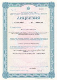 | Лицензии | 07.10.2014 Номер лицензии: ЛО-77-01-009116 Лицензируемый вид деятельности: Медицинская деятельность Дата внесения записи в реестр: 07.10.2014 Номер приказа о предоставлении лицензии: 677-Л Дата приказа о предоставлении лицензии: 07.10.2014 Адрес мест осуществления лицензируемого вида деятельности: 125319, г. Москва, пр. Кочновский, д. 4, корп. 1 |