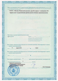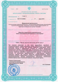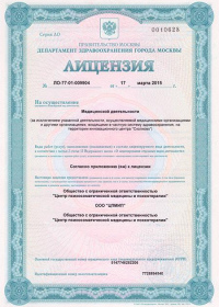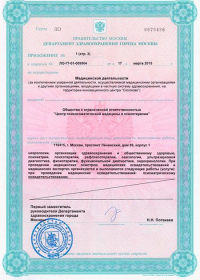 | Лицензии | 17.03.2015 Номер лицензии: ЛО-77-01-009904 Лицензируемый вид деятельности: Медицинская деятельность Дата внесения записи в реестр: 17.03.2015 Номер приказа о предоставлении лицензии: 133-Л Дата приказа о предоставлении лицензии: 17.03.2015 Адрес мест осуществления лицензируемого вида деятельности: 119415, г. Москва, проспект Ленинский, дом 98, корпус 1 |