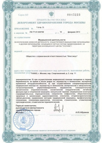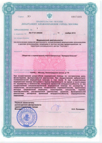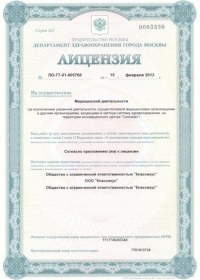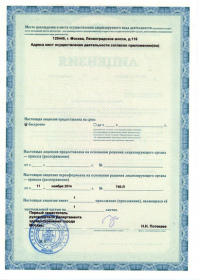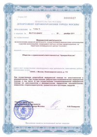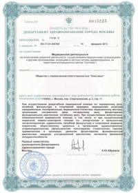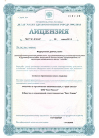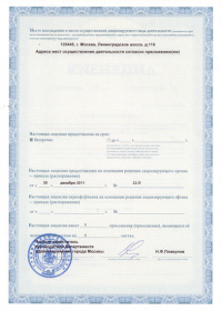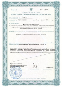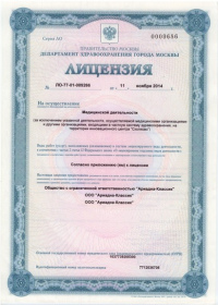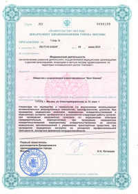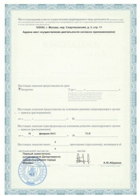 | Лицензии | 16.01.2020 Номер лицензии: ФС-99-01-009719 Лицензируемый вид деятельности: Медицинская деятельность Дата внесения записи в реестр: 16.01.2020 Номер приказа о предоставлении лицензии: 258 Дата приказа о предоставлении лицензии: 16.01.2020 Адрес мест осуществления лицензируемого вида деятельности: 105082, г. Москва, пер. Спартаковский, д. 2, стр. 1 12.11.2019 Номер лицензии: ЛО-77-01-019062 Лицензируемый вид деятельности: Медицинская деятельность Дата внесения записи в реестр: 12.11.2019 Номер приказа о предоставлении лицензии: 935-Л Дата приказа о предоставлении лицензии: 12.11.2019 Адрес мест осуществления лицензируемого вида деятельности: 105082, г. Москва, пер. Спартаковский, д. 2, стр. 11 12.09.2019 Номер лицензии: ЛО-77-03-000895 Лицензируемый вид деятельности: Деятельность по обороту наркотических средств, психотропных веществ и их прекурсоров, культивированию наркосодержащих растений Дата внесения записи в реестр: 12.09.2019 Номер приказа о предоставлении лицензии: 743-Л Дата приказа о предоставлении лицензии: 12.09.2019 Адрес мест осуществления лицензируемого вида деятельности: 105082, г. Москва, пер. Спартаковский, д. 2, стр. 11 11.09.2019 Номер лицензии: ЛО-77-01-018738 Лицензируемый вид деятельности: Медицинская деятельность Дата внесения записи в реестр: 11.09.2019 Номер приказа о предоставлении лицензии: 735-Л Дата приказа о предоставлении лицензии: 11.09.2019 Адрес мест осуществления лицензируемого вида деятельности: 105082, г. Москва, пер. Спартаковский, д. 2, стр. 11 |