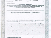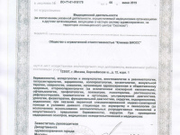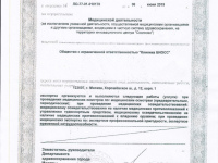 | Лицензии | 06.06.2019 Номер лицензии: ЛО-77-01-018178 Лицензируемый вид деятельности: Медицинская деятельность Дата внесения записи в реестр: 06.06.2019 Номер приказа о предоставлении лицензии: 422-Л Дата приказа о предоставлении лицензии: 06.06.2019 Адрес мест осуществления лицензируемого вида деятельности: 123007, г. Москва, Хорошёвское ш., д. 12, корп. 1 |
