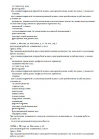 | Лицензии | 27.11.2019 Номер лицензии: ЛО-77-01-019158 Лицензируемый вид деятельности: Медицинская деятельность Дата внесения записи в реестр: 27.11.2019 Номер приказа о предоставлении лицензии: 989-Л Дата приказа о предоставлении лицензии: 27.11.2019 Адрес мест осуществления лицензируемого вида деятельности: 109544, г. Москва, ул. Школьная, д. 11/3 16.05.2019 Номер лицензии: ЛО-77-01-018047 Лицензируемый вид деятельности: Медицинская деятельность Дата внесения записи в реестр: 16.05.2019 Номер приказа о предоставлении лицензии: 354-Л Дата приказа о предоставлении лицензии: 16.05.2019 Адрес мест осуществления лицензируемого вида деятельности: 109544, г. Москва, ул. Школьная, д. 51-53 15.06.2016 Номер лицензии: ЛО-77-03-000577 Лицензируемый вид деятельности: Деятельность по обороту наркотических средств, психотропных веществ и их прекурсоров, культивированию наркосодержащих растений Дата внесения записи в реестр: 15.06.2016 Номер приказа о предоставлении лицензии: 371-Л Дата приказа о предоставлении лицензии: 15.06.2016 Адрес мест осуществления лицензируемого вида деятельности: 109544, 12.08.2014 Номер лицензии: ЛО-77-02-005963 Лицензируемый вид деятельности: Фармацевтическая деятельность Дата внесения записи в реестр: 12.08.2014 Номер приказа о предоставлении лицензии: 536-Л Дата приказа о предоставлении лицензии: 12.08.2014 Адрес мест осуществления лицензируемого вида деятельности: 109544, г. Москва, ул. Школьная, д.49 |