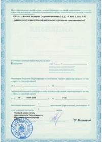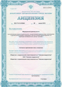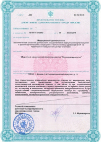 | Лицензии | 08.07.2015 Номер лицензии: ЛО-77-01-010540 Лицензируемый вид деятельности: Медицинская деятельность Дата внесения записи в реестр: 08.07.2015 Номер приказа о предоставлении лицензии: 375-Л Дата приказа о предоставлении лицензии: 08.07.2015 Адрес мест осуществления лицензируемого вида деятельности: 105120, г. Москва, 2-й Сыромятнический переулок, д. 10 |