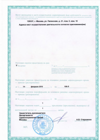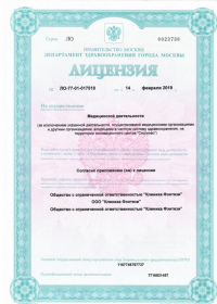 | Лицензии | 12.11.2019 Номер лицензии: ЛО-77-01-019063 Лицензируемый вид деятельности: Медицинская деятельность Дата внесения записи в реестр: 12.11.2019 Номер приказа о предоставлении лицензии: 935-Л Дата приказа о предоставлении лицензии: 12.11.2019 Адрес мест осуществления лицензируемого вида деятельности: 119048, г. Москва, ул. Ефремова, д. 10, корп. 1 14.02.2019 Номер лицензии: ЛО-77-01-017518 Лицензируемый вид деятельности: Медицинская деятельность Дата внесения записи в реестр: 14.02.2019 Номер приказа о предоставлении лицензии: 108-Л Дата приказа о предоставлении лицензии: 14.02.2019 Адрес мест осуществления лицензируемого вида деятельности: 119048, г. Москва, ул. Ефремова, д. 10, корп. 1 |