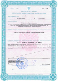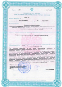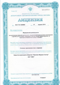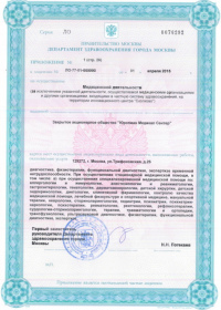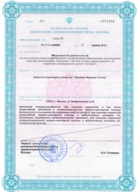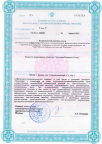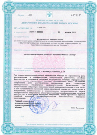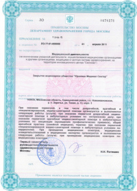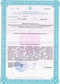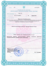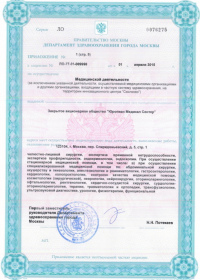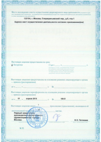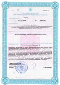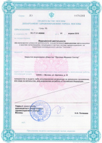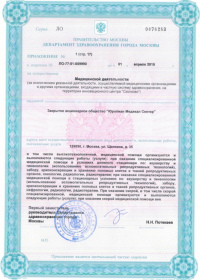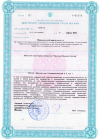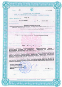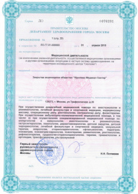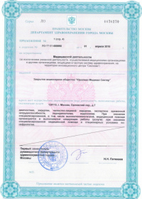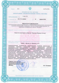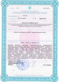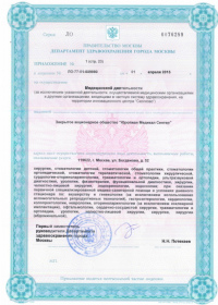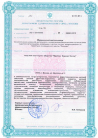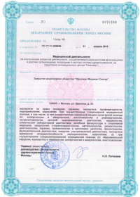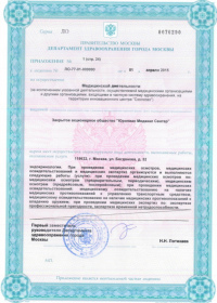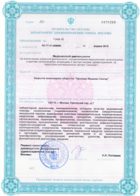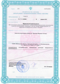 | Лицензии | 10.04.2020 Номер лицензии: ЛО-77-01-019876 Лицензируемый вид деятельности: Медицинская деятельность Дата внесения записи в реестр: 10.04.2020 Номер приказа о предоставлении лицензии: 248-Л Дата приказа о предоставлении лицензии: 10.04.2020 Адрес мест осуществления лицензируемого вида деятельности: 143082, Московская область, Одинцовский р-н, д. Жуковка, Рублево-Успенское шоссе, д. 187 01.04.2020 Номер лицензии: ФС-77-01-007341 Лицензируемый вид деятельности: Медицинская деятельность Дата внесения записи в реестр: 01.04.2020 Номер приказа о предоставлении лицензии: 464/20 Дата приказа о предоставлении лицензии: 01.04.2020 Адрес мест осуществления лицензируемого вида деятельности: 129090, г. Москва, ул. Щепкина, д. 35 15.11.2019 Номер лицензии: ЛО-77-01-019107 Лицензируемый вид деятельности: Медицинская деятельность Дата внесения записи в реестр: 15.11.2019 Номер приказа о предоставлении лицензии: 948-Л Дата приказа о предоставлении лицензии: 15.11.2019 Адрес мест осуществления лицензируемого вида деятельности: 127018, г. Москва, ул. Октябрьская, д. 33, литер А 05.09.2019 Номер лицензии: ЛО-77-01-018705 Лицензируемый вид деятельности: Медицинская деятельность Дата внесения записи в реестр: 05.09.2019 Номер приказа о предоставлении лицензии: 715-Л Дата приказа о предоставлении лицензии: 05.09.2019 Адрес мест осуществления лицензируемого вида деятельности: 119622, г. Москва, ул. Богданова, д. 52 30.05.2019 Номер лицензии: ЛО-50-03-000473 Лицензируемый вид деятельности: Деятельность по обороту наркотических средств, психотропных веществ и их прекурсоров, культивированию наркосодержащих растений Дата внесения записи в реестр: 30.05.2019 Номер приказа о предоставлении лицензии: 400-УЛ Дата приказа о предоставлении лицензии: 30.05.2019 Адрес мест осуществления лицензируемого вида деятельности: 129090, г. Москва, ул. Щепкина, д. 35 27.12.2018 Номер лицензии: ЛО-50-02-006459 Лицензируемый вид деятельности: Фармацевтическая деятельность Дата внесения записи в реестр: 27.12.2018 Номер приказа о предоставлении лицензии: 2124 Дата приказа о предоставлении лицензии: 27.12.2018 Адрес мест осуществления лицензируемого вида деятельности: 123104, г. Москва, пер. Спиридоньевский, д. 5, стр. 1 25.04.2018 Номер лицензии: ФС-99-01-009514 Лицензируемый вид деятельности: Медицинская деятельность Дата внесения записи в реестр: 25.04.2018 Номер приказа о предоставлении лицензии: 2644 Дата приказа о предоставлении лицензии: 25.04.2018 Адрес мест осуществления лицензируемого вида деятельности: 129090, г. Москва, ул. Щепкина, д. 35 10.03.2011 Номер лицензии: ЛО-77-01-003524 Лицензируемый вид деятельности: Медицинская деятельность Дата внесения записи в реестр: 10.03.2011 Номер приказа о предоставлении лицензии: 197 Дата приказа о предоставлении лицензии: 10.03.2011 Адрес мест осуществления лицензируемого вида деятельности: 129110, г. Москва, Орловский переулок, д. 7 10.03.2011 Номер лицензии: ЛО-77-01-003526 Лицензируемый вид деятельности: Медицинская деятельность Дата внесения записи в реестр: 10.03.2011 Номер приказа о предоставлении лицензии: 203 Дата приказа о предоставлении лицензии: 10.03.2011 Адрес мест осуществления лицензируемого вида деятельности: 123104, г. Москва, пер. Спиридоньевский, д. 5, стр. 1 10.03.2011 Номер лицензии: ЛО-77-01-003527 Лицензируемый вид деятельности: Медицинская деятельность Дата внесения записи в реестр: 10.03.2011 Номер приказа о предоставлении лицензии: 203 Дата приказа о предоставлении лицензии: 10.03.2011 Адрес мест осуществления лицензируемого вида деят