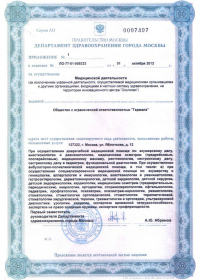 | Лицензии | 01.10.2012 Номер лицензии: ЛО-77-01-005323 Лицензируемый вид деятельности: Медицинская деятельность Дата внесения записи в реестр: 01.10.2012 Номер приказа о предоставлении лицензии: 542-Л Дата приказа о предоставлении лицензии: 01.10.2012 Адрес мест осуществления лицензируемого вида деятельности: 127322, г. Москва, ул. Яблочкова, д. 12 |