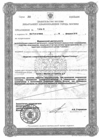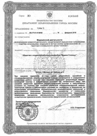 | Лицензии | 16.02.2018 Номер лицензии: ЛО-77-01-015648 Лицензируемый вид деятельности: Медицинская деятельность Дата внесения записи в реестр: 16.02.2018 Номер приказа о предоставлении лицензии: 122-Л Дата приказа о предоставлении лицензии: 16.02.2018 Адрес мест осуществления лицензируемого вида деятельности: 127224, г. Москва, ул. Грекова, д. 5 |