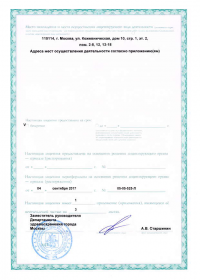 | Лицензии | 29.04.2019 Номер лицензии: ЛО-77-01-017993 Лицензируемый вид деятельности: Медицинская деятельность Дата внесения записи в реестр: 29.04.2019 Номер приказа о предоставлении лицензии: 333-Л Дата приказа о предоставлении лицензии: 29.04.2019 Адрес мест осуществления лицензируемого вида деятельности: 115114, г. Москва, ул. Кожевническая, дом 10, строение 1 05.09.2017 Номер лицензии: ЛО-77-02-008839 Лицензируемый вид деятельности: Фармацевтическая деятельность Дата внесения записи в реестр: 05.09.2017 Номер приказа о предоставлении лицензии: 05-05-528-Л Дата приказа о предоставлении лицензии: 05.09.2017 Адрес мест осуществления лицензируемого вида деятельности: 115114, г. Москва, ул. Кожевническая, д. 10, стр. 1 |