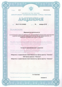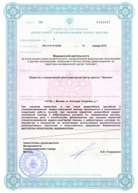 | Лицензии | 15.01.2018 Номер лицензии: ЛО-77-01-015482 Лицензируемый вид деятельности: Медицинская деятельность Дата внесения записи в реестр: 15.01.2018 Номер приказа о предоставлении лицензии: 17-Л Дата приказа о предоставлении лицензии: 15.01.2018 Адрес мест осуществления лицензируемого вида деятельности: 115184, г. Москва, ул. Большая Татарская, д. 7 |