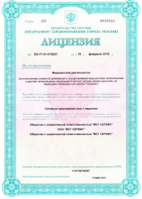 | Лицензии | 30.11.2018 Номер лицензии: ЛО-77-01-017104 Лицензируемый вид деятельности: Медицинская деятельность Дата внесения записи в реестр: 30.11.2018 Номер приказа о предоставлении лицензии: 921-Л Дата приказа о предоставлении лицензии: 30.11.2018 Адрес мест осуществления лицензируемого вида деятельности: 117105, г. Москва, ул. Нагатинская, д. 1, стр. 25 |