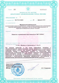 Лицензии | 30.11.2018 Номер лицензии: ЛО-77-01-017104 Лицензируемый вид деятельности: Медицинская деятельность Дата внесения записи в реестр: 30.11.2018 Номер приказа о предоставлении лицензии: 921-Л Дата приказа о предоставлении лицензии: 30.11.2018 Адрес мест осуществления лицензируемого вида деятельности: 117105, г. Москва, ул. Нагатинская, д. 1, стр. 25 |