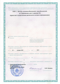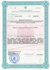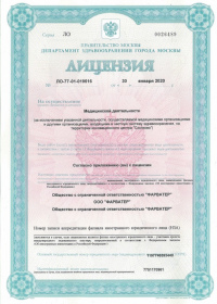 | Лицензии | 30.01.2020 Номер лицензии: ЛО-77-01-019516 Лицензируемый вид деятельности: Медицинская деятельность Дата внесения записи в реестр: 30.01.2020 Номер приказа о предоставлении лицензии: 62-Л Дата приказа о предоставлении лицензии: 30.01.2020 Адрес мест осуществления лицензируемого вида деятельности: 105062, г. Москва, пер. Фурманный, д. 9/12 |