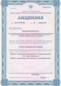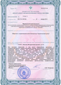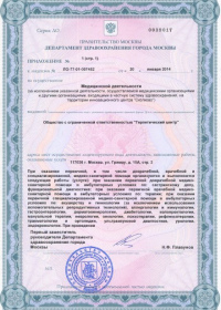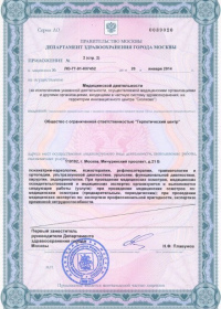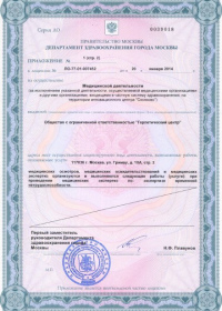 | Лицензии | 01.11.2017 Номер лицензии: ЛО-77-01-015107 Лицензируемый вид деятельности: Медицинская деятельность Дата внесения записи в реестр: 01.11.2017 Номер приказа о предоставлении лицензии: 05-05-675-Л Дата приказа о предоставлении лицензии: 01.11.2017 Адрес мест осуществления лицензируемого вида деятельности: 117036, г. Москва, ул. Гримау, д. 10А, стр. 2 |