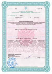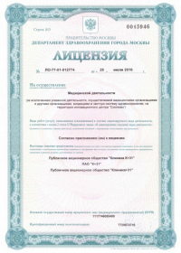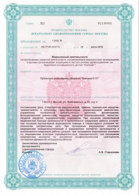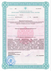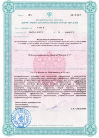 | Лицензии | 31.01.2020 Номер лицензии: ЛО-76-01-002772 Лицензируемый вид деятельности: Медицинская деятельность Дата внесения записи в реестр: 31.01.2020 Номер приказа о предоставлении лицензии: 50 ол Дата приказа о предоставлении лицензии: 31.01.2020 Адрес мест осуществления лицензируемого вида деятельности: 150062, Ярославская область, г. Ярославль, ул. Яковлевская, д. 7 26.06.2019 Номер лицензии: ЛО-76-01-002602 Лицензируемый вид деятельности: Медицинская деятельность Дата внесения записи в реестр: 26.06.2019 Номер приказа о предоставлении лицензии: 357 ол Дата приказа о предоставлении лицензии: 26.06.2019 Адрес мест осуществления лицензируемого вида деятельности: 150062, Ярославская область, г. Ярославль, ул. Яковлевская, д. 7 25.04.2018 Номер лицензии: ЛО-77-01-015979 Лицензируемый вид деятельности: Медицинская деятельность Дата внесения записи в реестр: 25.04.2018 Номер приказа о предоставлении лицензии: 290-Л Дата приказа о предоставлении лицензии: 25.04.2018 Адрес мест осуществления лицензируемого вида деятельности: 119415, г. Москва, ул. Лобачевского, д. 42, стр. 4 29.11.2017 Номер лицензии: ФС-99-01-009449 Лицензируемый вид деятельности: Медицинская деятельность Дата внесения записи в реестр: 29.11.2017 Номер приказа о предоставлении лицензии: 9854 Дата приказа о предоставлении лицензии: 29.11.2017 Адрес мест осуществления лицензируемого вида деятельности: 119415, г. Москва, ул. Лобачевского, д. 42, стр. 4 30.03.2017 Номер лицензии: ЛО-77-03-000678 Лицензируемый вид деятельности: Деятельность по обороту наркотических средств, психотропных веществ и их прекурсоров, культивированию наркосодержащих растений Дата внесения записи в реестр: 30.03.2017 Номер приказа о предоставлении лицензии: 178-Л Дата приказа о предоставлении лицензии: 30.03.2017 Адрес мест осуществления лицензируемого вида деятельности: 119415, г. Москва, ул. Лобачевского, д. 42, стр. 4 24.10.2011 Номер лицензии: ЛО-77-01-004317 Лицензируемый вид деятельности: Медицинская деятельность Дата внесения записи в реестр: 24.10.2011 Номер приказа о предоставлении лицензии: 1131 Дата приказа о предоставлении лицензии: 24.10.2011 Адрес мест осуществления лицензируемого вида деятельности: 119415, г. Москва, ул. Лобачевского, д. 42, стр. 4 |