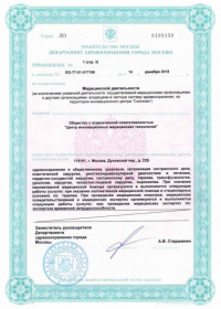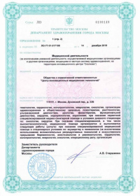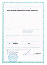 | Лицензии | 18.02.2020 Номер лицензии: ЛО-77-01-019644 Лицензируемый вид деятельности: Медицинская деятельность Дата внесения записи в реестр: 18.02.2020 Номер приказа о предоставлении лицензии: 119-Л Дата приказа о предоставлении лицензии: 18.02.2020 Адрес мест осуществления лицензируемого вида деятельности: 115191, г. Москва, Духовской пер., д. 22Б 14.12.2018 Номер лицензии: ЛО-77-01-017198 Лицензируемый вид деятельности: Медицинская деятельность Дата внесения записи в реестр: 14.12.2018 Номер приказа о предоставлении лицензии: 965-Л Дата приказа о предоставлении лицензии: 14.12.2018 Адрес мест осуществления лицензируемого вида деятельности: 115191, г. Москва, Духовской пер., д. 22Б 04.09.2015 Номер лицензии: ЛО-77-03-000451 Лицензируемый вид деятельности: Деятельность по обороту наркотических средств, психотропных веществ и их прекурсоров, культивированию наркосодержащих растений Дата внесения записи в реестр: 04.09.2015 Номер приказа о предоставлении лицензии: 511-Л Дата приказа о предоставлении лицензии: 04.09.2015 Адрес мест осуществления лицензируемого вида деятельности: 115191, г. Москва, Духовской пер., д. 22Б |