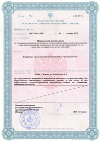 | Лицензии | 04.06.2018 Номер лицензии: ЛО-77-03-000784 Лицензируемый вид деятельности: Деятельность по обороту наркотических средств, психотропных веществ и их прекурсоров, культивированию наркосодержащих растений Дата внесения записи в реестр: 04.06.2018 Номер приказа о предоставлении лицензии: 410-Л Дата приказа о предоставлении лицензии: 04.06.2018 Адрес мест осуществления лицензируемого вида деятельности: 107014, г. Москва, ул. Бабаевская, д. 6 02.08.2016 Номер лицензии: ЛО-77-01-012784 Лицензируемый вид деятельности: Медицинская деятельность Дата внесения записи в реестр: 02.08.2016 Номер приказа о предоставлении лицензии: 470-Л Дата приказа о предоставлении лицензии: 02.08.2016 Адрес мест осуществления лицензируемого вида деятельности: 107014, г. Москва, ул. Бабаевская, д. 6 |