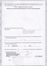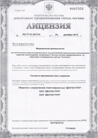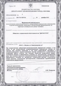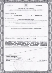 | Лицензии | 24.12.2013 Номер лицензии: ЛО-77-01-007316 Лицензируемый вид деятельности: Медицинская деятельность Дата внесения записи в реестр: 24.12.2013 Номер приказа о предоставлении лицензии: 719-Л Дата приказа о предоставлении лицензии: 24.12.2013 Адрес мест осуществления лицензируемого вида деятельности: 113216, г. Москва, ул. Грина, д.3, корп.2 25.07.2012 Номер лицензии: ЛО-77-01-005121. Лицензируемый вид деятельности: Медицинская деятельность Дата внесения записи в реестр: 25.07.2012 Номер приказа о предоставлении лицензии: 401-Л Дата приказа о предоставлении лицензии: 25.07.2012 Адрес мест осуществления лицензируемого вида деятельности: 113216, г. Москва, ул. Грина, д.3, корп.2 |