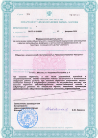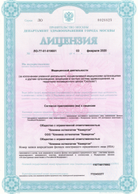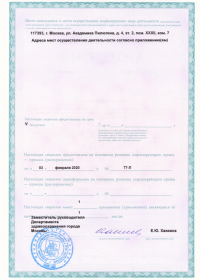 | Лицензии | 03.02.2020 Номер лицензии: ЛО-77-01-019551 Лицензируемый вид деятельности: Медицинская деятельность Дата внесения записи в реестр: 03.02.2020 Номер приказа о предоставлении лицензии: 77-Л Дата приказа о предоставлении лицензии: 03.02.2020 Адрес мест осуществления лицензируемого вида деятельности: 117393, г. Москва, ул. Академика Пилюгина, д. 4 |