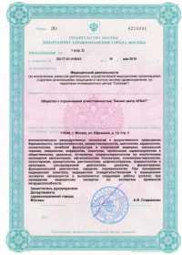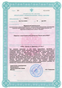 | Лицензии | 16.05.2019 Номер лицензии: ЛО-77-01-018043 Лицензируемый вид деятельности: Медицинская деятельность Дата внесения записи в реестр: 16.05.2019 Номер приказа о предоставлении лицензии: 354-Л Дата приказа о предоставлении лицензии: 16.05.2019 Адрес мест осуществления лицензируемого вида деятельности: 119048, г. Москва, ул. Ефремова, д. 12, стр. 2 |