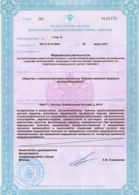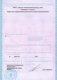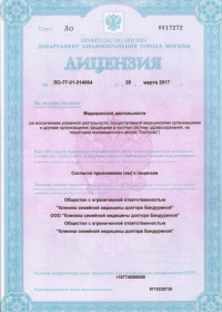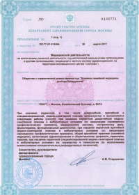 | Лицензии | 28.03.2017 Номер лицензии: ЛО-77-01-014064 Лицензируемый вид деятельности: Медицинская деятельность Дата внесения записи в реестр: 28.03.2017 Номер приказа о предоставлении лицензии: 166-Л Дата приказа о предоставлении лицензии: 28.03.2017 Адрес мест осуществления лицензируемого вида деятельности: 105077, г. Москва, Измайловский бульвар, д. 60/10 |