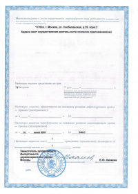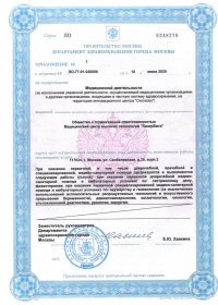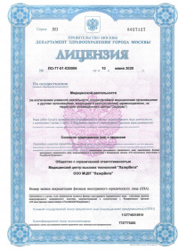 | Лицензии | 10.01.2013 Номер лицензии: ЛО-77-01-005618 Лицензируемый вид деятельности: Медицинская деятельность Дата внесения записи в реестр: 10.01.2013 Номер приказа о предоставлении лицензии: 4-Л Дата приказа о предоставлении лицензии: 10.01.2013 Адрес мест осуществления лицензируемого вида деятельности: 117624, г. Москва, ул. Скобелевская, д.25, корп.2 |