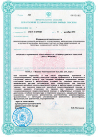 | Лицензии | 15.08.2016 Номер лицензии: ЛО-77-01-012887 Лицензируемый вид деятельности: Медицинская деятельность Дата внесения записи в реестр: 15.08.2016 Номер приказа о предоставлении лицензии: 500-Л Дата приказа о предоставлении лицензии: 15.08.2016 Адрес мест осуществления лицензируемого вида деятельности: 109369, г. Москва, Новочеркасский бульвар, д.55, корп.2 |