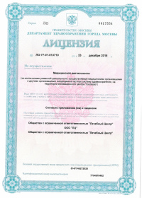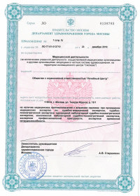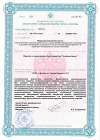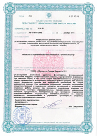| Лицензии | 24.03.2020 Номер лицензии: ЛО-77-01-019813 Лицензируемый вид деятельности: Медицинская деятельность Дата внесения записи в реестр: 24.03.2020 Номер приказа о предоставлении лицензии: 221-Л Дата приказа о предоставлении лицензии: 24.03.2020 Адрес мест осуществления лицензируемого вида деятельности: 119034, г. Москва, ул. Тимура Фрунзе, д. 15/1 11.03.2020 Номер лицензии: ЛО-77-01-019763 Лицензируемый вид деятельности: Медицинская деятельность Дата внесения записи в реестр: 11.03.2020 Номер приказа о предоставлении лицензии: 185-Л Дата приказа о предоставлении лицензии: 11.03.2020 Адрес мест осуществления лицензируемого вида деятельности: 119034, г. Москва, ул. Тимура Фрунзе, д. 15/1 28.05.2019 Номер лицензии: ЛО-77-01-018140 Лицензируемый вид деятельности: Медицинская деятельность Дата внесения записи в реестр: 28.05.2019 Номер приказа о предоставлении лицензии: 397-Л Дата приказа о предоставлении лицензии: 28.05.2019 Адрес мест осуществления лицензируемого вида деятельности: 119021, г. Москва, ул. Россолимо, д. 5, стр. 1 29.04.2019 Номер лицензии: ЛО-77-03-000867 Лицензируемый вид деятельности: Деятельность по обороту наркотических средств, психотропных веществ и их прекурсоров, культивированию наркосодержащих растений Дата внесения записи в реестр: 29.04.2019 Номер приказа о предоставлении лицензии: 331-Л Дата приказа о предоставлении лицензии: 29.04.2019 Адрес мест осуществления лицензируемого вида деятельности: 119021, г. Москва, ул. Тимура Фрунзе, д. 15/1 |