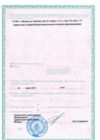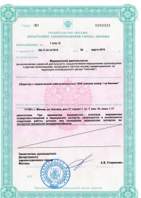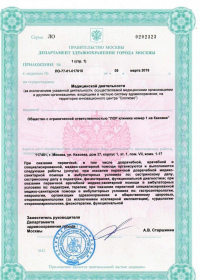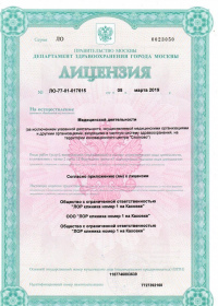 | Лицензии | 05.03.2019 Номер лицензии: ЛО-77-01-017615 Лицензируемый вид деятельности: Медицинская деятельность Дата внесения записи в реестр: 05.03.2019 Номер приказа о предоставлении лицензии: 174-Л Дата приказа о предоставлении лицензии: 05.03.2019 Адрес мест осуществления лицензируемого вида деятельности: 117461, г. Москва, ул. Каховка, дом 37, корпус 1, эт. 1, пом. VII, комн. 1-17 |