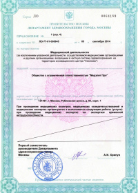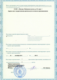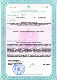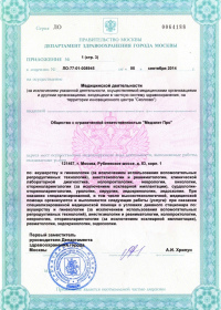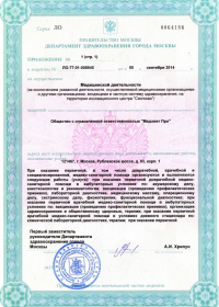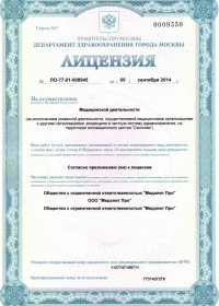 | Лицензии | 12.11.2019 Номер лицензии: ЛО-77-01-019056 Лицензируемый вид деятельности: Медицинская деятельность Дата внесения записи в реестр: 12.11.2019 Номер приказа о предоставлении лицензии: 935-Л Дата приказа о предоставлении лицензии: 12.11.2019 Адрес мест осуществления лицензируемого вида деятельности: 121467, г. Москва, Рублевское шоссе, д. 83, корп. 1 07.06.2017 Номер лицензии: ЛО-77-01-014370 Лицензируемый вид деятельности: Медицинская деятельность Дата внесения записи в реестр: 07.06.2017 Номер приказа о предоставлении лицензии: 336-Л Дата приказа о предоставлении лицензии: 07.06.2017 Адрес мест осуществления лицензируемого вида деятельности: 121467, г. Москва, Рублевское шоссе, д. 83, корп. 1 13.05.2014 Номер лицензии: ЛО-77-03-000250 Лицензируемый вид деятельности: Деятельность по обороту наркотических средств, психотропных веществ и их прекурсоров, культивированию наркосодержащих растений Дата внесения записи в реестр: 13.05.2014 Номер приказа о предоставлении лицензии: 311-Л Дата приказа о предоставлении лицензии: 13.05.2014 Адрес мест осуществления лицензируемого вида деятельности: 121467, г. Москва, Рублевское шоссе, д. 83, корп. 1 |
