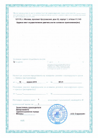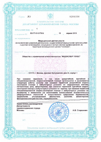 | Лицензии | 09.09.2019 Номер лицензии: ЛО-77-01-018719 Лицензируемый вид деятельности: Медицинская деятельность Дата внесения записи в реестр: 09.09.2019 Номер приказа о предоставлении лицензии: 725-Л Дата приказа о предоставлении лицензии: 09.09.2019 Адрес мест осуществления лицензируемого вида деятельности: 121170, г. Москва, проспект Кутузовский, дом 32, корпус 1 |