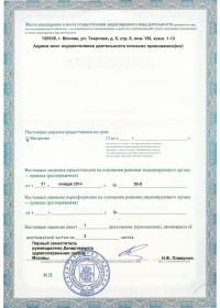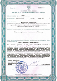 | Лицензии | 21.01.2014 Номер лицензии: ЛО-77-01-007472 Лицензируемый вид деятельности: Медицинская деятельность Дата внесения записи в реестр: 21.01.2014 Номер приказа о предоставлении лицензии: 30-Л Дата приказа о предоставлении лицензии: 21.01.2014 Адрес мест осуществления лицензируемого вида деятельности: 125009, г. Москва, ул. Тверская, д. 6, стр. 6 |