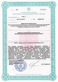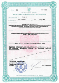 | Лицензии | 29.11.2019 Номер лицензии: ЛО-77-01-019178 Лицензируемый вид деятельности: Медицинская деятельность Дата внесения записи в реестр: 29.11.2019 Номер приказа о предоставлении лицензии: 999-Л Дата приказа о предоставлении лицензии: 29.11.2019 Адрес мест осуществления лицензируемого вида деятельности: 119571, г. Москва, улица 26-ти Бакинских Комиссаров, дом 11 |