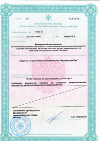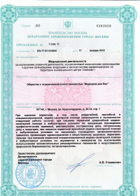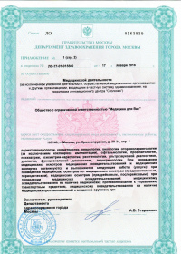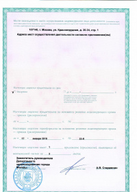| Лицензии | 17.01.2018 Номер лицензии: ЛО-77-01-015500 Лицензируемый вид деятельности: Медицинская деятельность Дата внесения записи в реестр: 17.01.2018 Номер приказа о предоставлении лицензии: 22-Л Дата приказа о предоставлении лицензии: 17.01.2018 Адрес мест осуществления лицензируемого вида деятельности: 107140, г. Москва, ул. Краснопрудная, д. 30-34, стр. 1 |