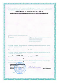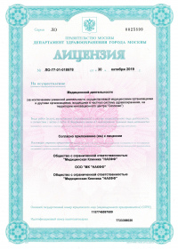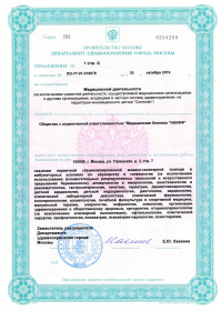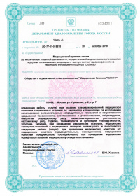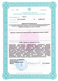 | Лицензии | 30.10.2019 Номер лицензии: ЛО-77-01-018978 Лицензируемый вид деятельности: Медицинская деятельность Дата внесения записи в реестр: 30.10.2019 Номер приказа о предоставлении лицензии: 901-Л Дата приказа о предоставлении лицензии: 30.10.2019 Адрес мест осуществления лицензируемого вида деятельности: 109089, г. Москва, ул. Угрешская, д. 2, стр. 7 09.07.2019 Номер лицензии: ЛО-77-01-018351 Лицензируемый вид деятельности: Медицинская деятельность Дата внесения записи в реестр: 09.07.2019 Номер приказа о предоставлении лицензии: 519-Л Дата приказа о предоставлении лицензии: 09.07.2019 Адрес мест осуществления лицензируемого вида деятельности: 109089, г. Москва, ул. Угрешская, д. 2, стр. 7 16.05.2018 Номер лицензии: ЛО-77-03-000775 Лицензируемый вид деятельности: Деятельность по обороту наркотических средств, психотропных веществ и их прекурсоров, культивированию наркосодержащих растений Дата внесения записи в реестр: 16.05.2018 Номер приказа о предоставлении лицензии: 342-Л Дата приказа о предоставлении лицензии: 16.05.2018 Адрес мест осуществления лицензируемого вида деятельности: 115088, г. Москва, Угрешская ул, д. 2, стр. 7 09.08.2016 Номер лицензии: ЛО-77-02-007876 Лицензируемый вид деятельности: Фармацевтическая деятельность Дата внесения записи в реестр: 09.08.2016 Номер приказа о предоставлении лицензии: 484-Л Дата приказа о предоставлении лицензии: 09.08.2016 Адрес мест осуществления лицензируемого вида деятельности: 115088, г. Москва, ул. Угрешская, д. 2, стр. 7 28.04.2016 Номер лицензии: ЛО-77-01-012244 Лицензируемый вид деятельности: Медицинская деятельность Дата внесения записи в реестр: 28.04.2016 Номер приказа о предоставлении лицензии: 269-Л Дата приказа о предоставлении лицензии: 28.04.2016 Адрес мест осуществления лицензируемого вида деятельности: 109089, г. Москва, ул. Угрешская, д. 2, стр. 7 |