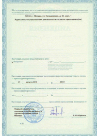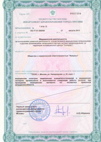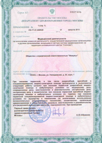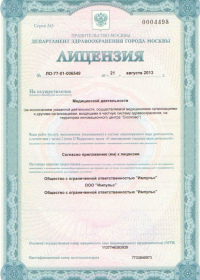 | Лицензии | 21.08.2013 Номер лицензии: ЛО-77-01-006549 Лицензируемый вид деятельности: Медицинская деятельность Дата внесения записи в реестр: 21.08.2013 Номер приказа о предоставлении лицензии: 436-Л Дата приказа о предоставлении лицензии: 21.08.2013 Адрес мест осуществления лицензируемого вида деятельности: 125363, г. Москва, ул. Нелидовская, д. 20, корп. 1 |
