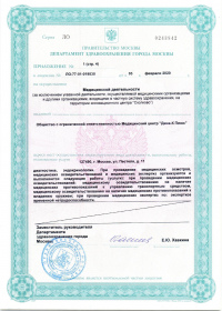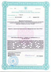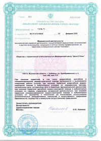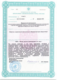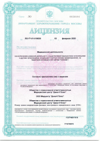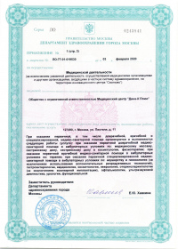 | Лицензии | 14.12.2018 Номер лицензии: ЛО-77-01-017199 Лицензируемый вид деятельности: Медицинская деятельность Дата внесения записи в реестр: 14.12.2018 Номер приказа о предоставлении лицензии: 965-Л Дата приказа о предоставлении лицензии: 14.12.2018 Адрес мест осуществления лицензируемого вида деятельности: 103064, г. Москва, ул. Земляной Вал, д. 38-40, стр. 6 18.10.2010 Номер лицензии: ЛО-77-01-003034 Лицензируемый вид деятельности: Медицинская деятельность Дата внесения записи в реестр: 18.10.2010 Номер приказа о предоставлении лицензии: 1840 Дата приказа о предоставлении лицензии: 18.10.2010 Адрес мест осуществления лицензируемого вида деятельности: 125047, г. Москва, ул. 1-я Тверская-Ямская, д.29/66, стр.1 09.08.2010 Номер лицензии: ЛО-77-01-002853 Лицензируемый вид деятельности: Медицинская деятельность Дата внесения записи в реестр: 09.08.2010 Номер приказа о предоставлении лицензии: 1240 Дата приказа о предоставлении лицензии: 09.08.2010 Адрес мест осуществления лицензируемого вида деятельности: 105064, г. Москва, Земляной Вал, д.38-40, стр.6 04.12.2009 Номер лицензии: ЛО-77-01-002016дубликат Лицензируемый вид деятельности: Медицинская деятельность Дата внесения записи в реестр: 04.12.2009 Номер приказа о предоставлении лицензии: 1601 Дата приказа о предоставлении лицензии: 04.12.2009 Адрес мест осуществления лицензируемого вида деятельности: 103064, г. Москва, ул. Земляной Вал, д. 38-40, стр. 6 04.10.2009 Номер лицензии: ЛО-77-01- 001566 Лицензируемый вид деятельности: Медицинская деятельность Дата внесения записи в реестр: 04.10.2009 Номер приказа о предоставлении лицензии: 1231 Дата приказа о предоставлении лицензии: 01.10.2009 Адрес мест осуществления лицензируемого вида деятельности: 27.08.2009 Номер лицензии: ЛО-77-01-001699дубликат Лицензируемый вид деятельности: Медицинская деятельность Дата внесения записи в реестр: 27.08.2009 Номер приказа о предоставлении лицензии: 1047 Дата приказа о предоставлении лицензии: 27.08.2009 Адрес мест осуществления лицензируемого вида деятельности: 103064, г. Москва, ул. Земляной Вал, д. 38-40, стр. 6 28.07.2009 Номер лицензии: ЛО-77-01-001612дубликат Лицензируемый вид деятельности: Медицинская деятельность Дата внесения записи в реестр: 28.07.2009 Номер приказа о предоставлении лицензии: 901 Дата приказа о предоставлении лицензии: 28.07.2009 Адрес мест осуществления лицензируемого вида деятельности: 125047, г. Москва, ул. 1-я Тверская-Ямская, д. 29/66, стр. 1 19.12.2008 Номер лицензии: ЛО-77-01-000864дубликат Лицензируемый вид деятельности: Медицинская деятельность Дата внесения записи в реестр: 19.12.2008 Номер приказа о предоставлении лицензии: 1079 Дата приказа о предоставлении лицензии: 19.12.2008 Адрес мест осуществления лицензируемого вида деятельности: 107045, г. Москва, Селиверстов пер., д. 8, стр. 1 04.12.2008 Номер лицензии: ЛО-77-01-000860дубликат Лицензируемый вид деятельности: Медицинская деятельность Дата внесения записи в реестр: 04.12.2008 Номер приказа о предоставлении лицензии: 1024 Дата приказа о предоставлении лицензии: 04.12.2008 Адрес мест осуществления лицензируемого вида деятельности: 103045, г. Москва, Селиверстов пер., д. 8, стр. 1 04.12.2008 Номер лицензии: ЛО-77-01-000861дубликат Лицензируемый вид деятельности: Медицинская деятельность Дата внесения записи в реестр: 04.12.2008 Номер приказа о предоставлении лицензии: 1024 Дата приказа о предоставлении лицензии: 04.12.2008 Адрес мест осуществления лицензируемого вида деятельности: 103064, г. Москва, ул. Земляной Вал, д. 38-40, стр. 6 |