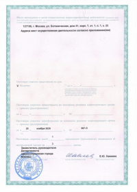 Адрес мест осуществления лицензируемого вида деятельности: 127106, г. Москва, ул. Ботаническая, д. 41, корп. 7
