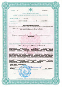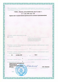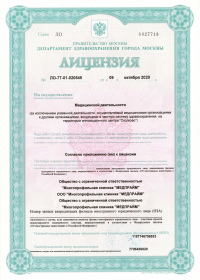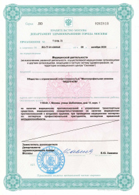 | Лицензии | 02.07.2019 Номер лицензии: ЛО-77-01-018331 Лицензируемый вид деятельности: Медицинская деятельность Дата внесения записи в реестр: 02.07.2019 Номер приказа о предоставлении лицензии: 497-Л Дата приказа о предоставлении лицензии: 02.07.2019 Адрес мест осуществления лицензируемого вида деятельности: 119049, г. Москва, улица Шаболовка, дом 10, корп. 1 |