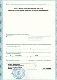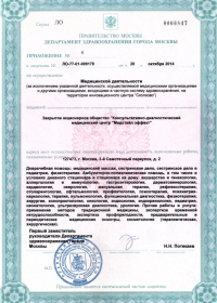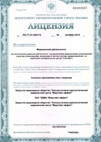 | Лицензии | 20.08.2015 Номер лицензии: ЛО-77-01-010794 Лицензируемый вид деятельности: Медицинская деятельность Дата внесения записи в реестр: 20.08.2015 Номер приказа о предоставлении лицензии: 481-Л Дата приказа о предоставлении лицензии: 20.08.2015 Адрес мест осуществления лицензируемого вида деятельности: 127473, г. Москва, 3-й Самотечный переулок, д. 2 20.10.2014 Номер лицензии: ЛО-77-01-009178 Лицензируемый вид деятельности: Медицинская деятельность Дата внесения записи в реестр: 20.10.2014 Номер приказа о предоставлении лицензии: 705-Л Дата приказа о предоставлении лицензии: 20.10.2014 Адрес мест осуществления лицензируемого вида деятельности: 127473, г. Москва, 3-й Самотечный переулок, д. 2 08.09.2014 Номер лицензии: ЛО-77-01-008947 Лицензируемый вид деятельности: Медицинская деятельность Дата внесения записи в реестр: 08.09.2014 Номер приказа о предоставлении лицензии: 609-Л Дата приказа о предоставлении лицензии: 08.09.2014 Адрес мест осуществления лицензируемого вида деятельности: 107113, г. Москва, ул. Маленковская, д. 32, стр.1 17.07.2014 Номер лицензии: ЛО-77-02-005911 Лицензируемый вид деятельности: Фармацевтическая деятельность Дата внесения записи в реестр: 17.07.2014 Номер приказа о предоставлении лицензии: 485-Л Дата приказа о предоставлении лицензии: 17.07.2014 Адрес мест осуществления лицензируемого вида деятельности: 127473, г. Москва, 3-ий Самотечный переулок, д.2 01.09.2010 Номер лицензии: ЛО-77-01-002903 Лицензируемый вид деятельности: Медицинская деятельность Дата внесения записи в реестр: 01.09.2010 Номер приказа о предоставлении лицензии: 1437 Дата приказа о предоставлении лицензии: 01.09.2010 Адрес мест осуществления лицензируемого вида деятельности: 628260, Ханты-Мансийский автономный округ - Югра, Югорск, Тюменская область, ул. Железнодорожная, д.23 "А" |