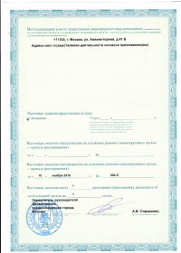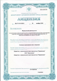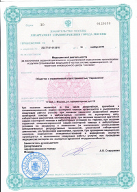 | Лицензии | 14.12.2018 Номер лицензии: ЛО-77-01-017199 Лицензируемый вид деятельности: Медицинская деятельность Дата внесения записи в реестр: 14.12.2018 Номер приказа о предоставлении лицензии: 965-Л Дата приказа о предоставлении лицензии: 14.12.2018 Адрес мест осуществления лицензируемого вида деятельности: 103064, г. Москва, ул. Земляной Вал, д. 38-40, стр. 6 18.10.2010 Номер лицензии: ЛО-77-01-003034 Лицензируемый вид деятельности: Медицинская деятельность Дата внесения записи в реестр: 18.10.2010 Номер приказа о предоставлении лицензии: 1840 Дата приказа о предоставлении лицензии: 18.10.2010 Адрес мест осуществления лицензируемого вида деятельности: 125047, г. Москва, ул. 1-я Тверская-Ямская, д.29/66, стр.1 09.08.2010 Номер лицензии: ЛО-77-01-002853 Лицензируемый вид деятельности: Медицинская деятельность Дата внесения записи в реестр: 09.08.2010 Номер приказа о предоставлении лицензии: 1240 Дата приказа о предоставлении лицензии: 09.08.2010 Адрес мест осуществления лицензируемого вида деятельности: 105064, г. Москва, Земляной Вал, д.38-40, стр.6 04.12.2009 Номер лицензии: ЛО-77-01-002016дубликат Лицензируемый вид деятельности: Медицинская деятельность Дата внесения записи в реестр: 04.12.2009 Номер приказа о предоставлении лицензии: 1601 Дата приказа о предоставлении лицензии: 04.12.2009 Адрес мест осуществления лицензируемого вида деятельности: 103064, г. Москва, ул. Земляной Вал, д. 38-40, стр. 6 04.10.2009 Номер лицензии: ЛО-77-01- 001566 Лицензируемый вид деятельности: Медицинская деятельность Дата внесения записи в реестр: 04.10.2009 Номер приказа о предоставлении лицензии: 1231 Дата приказа о предоставлении лицензии: 01.10.2009 Адрес мест осуществления лицензируемого вида деятельности: 27.08.2009 Номер лицензии: ЛО-77-01-001699дубликат Лицензируемый вид деятельности: Медицинская деятельность Дата внесения записи в реестр: 27.08.2009 Номер приказа о предоставлении лицензии: 1047 Дата приказа о предоставлении лицензии: 27.08.2009 Адрес мест осуществления лицензируемого вида деятельности: 103064, г. Москва, ул. Земляной Вал, д. 38-40, стр. 6 28.07.2009 Номер лицензии: ЛО-77-01-001612дубликат Лицензируемый вид деятельности: Медицинская деятельность Дата внесения записи в реестр: 28.07.2009 Номер приказа о предоставлении лицензии: 901 Дата приказа о предоставлении лицензии: 28.07.2009 Адрес мест осуществления лицензируемого вида деятельности: 125047, г. Москва, ул. 1-я Тверская-Ямская, д. 29/66, стр. 1 19.12.2008 Номер лицензии: ЛО-77-01-000864дубликат Лицензируемый вид деятельности: Медицинская деятельность Дата внесения записи в реестр: 19.12.2008 Номер приказа о предоставлении лицензии: 1079 Дата приказа о предоставлении лицензии: 19.12.2008 Адрес мест осуществления лицензируемого вида деятельности: 107045, г. Москва, Селиверстов пер., д. 8, стр. 1 04.12.2008 Номер лицензии: ЛО-77-01-000860дубликат Лицензируемый вид деятельности: Медицинская деятельность Дата внесения записи в реестр: 04.12.2008 Номер приказа о предоставлении лицензии: 1024 Дата приказа о предоставлении лицензии: 04.12.2008 Адрес мест осуществления лицензируемого вида деятельности: 103045, г. Москва, Селиверстов пер., д. 8, стр. 1 04.12.2008 Номер лицензии: ЛО-77-01-000861дубликат Лицензируемый вид деятельности: Медицинская деятельность Дата внесения записи в реестр: 04.12.2008 Номер приказа о предоставлении лицензии: 1024 Дата приказа о предоставлении лицензии: 04.12.2008 Адрес мест осуществления лицензируемого вида деятельности: 103064, г. Москва, ул. Земляной Вал, д. 38-40, стр. 6 |