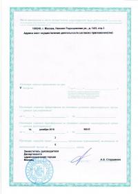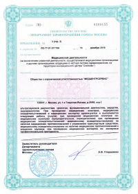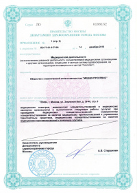 | Лицензии | 14.12.2018 Номер лицензии: ЛО-77-01-017199 Лицензируемый вид деятельности: Медицинская деятельность Дата внесения записи в реестр: 14.12.2018 Номер приказа о предоставлении лицензии: 965-Л Дата приказа о предоставлении лицензии: 14.12.2018 Адрес мест осуществления лицензируемого вида деятельности: 103064, г. Москва, ул. Земляной Вал, д. 38-40, стр. 6 18.10.2010 Номер лицензии: ЛО-77-01-003034 Лицензируемый вид деятельности: Медицинская деятельность Дата внесения записи в реестр: 18.10.2010 Номер приказа о предоставлении лицензии: 1840 Дата приказа о предоставлении лицензии: 18.10.2010 Адрес мест осуществления лицензируемого вида деятельности: 125047, г. Москва, ул. 1-я Тверская-Ямская, д.29/66, стр.1 09.08.2010 Номер лицензии: ЛО-77-01-002853 Лицензируемый вид деятельности: Медицинская деятельность Дата внесения записи в реестр: 09.08.2010 Номер приказа о предоставлении лицензии: 1240 Дата приказа о предоставлении лицензии: 09.08.2010 Адрес мест осуществления лицензируемого вида деятельности: 105064, г. Москва, Земляной Вал, д.38-40, стр.6 04.12.2009 Номер лицензии: ЛО-77-01-002016дубликат Лицензируемый вид деятельности: Медицинская деятельность Дата внесения записи в реестр: 04.12.2009 Номер приказа о предоставлении лицензии: 1601 Дата приказа о предоставлении лицензии: 04.12.2009 Адрес мест осуществления лицензируемого вида деятельности: 103064, г. Москва, ул. Земляной Вал, д. 38-40, стр. 6 04.10.2009 Номер лицензии: ЛО-77-01- 001566 Лицензируемый вид деятельности: Медицинская деятельность Дата внесения записи в реестр: 04.10.2009 Номер приказа о предоставлении лицензии: 1231 Дата приказа о предоставлении лицензии: 01.10.2009 Адрес мест осуществления лицензируемого вида деятельности: 27.08.2009 Номер лицензии: ЛО-77-01-001699дубликат Лицензируемый вид деятельности: Медицинская деятельность Дата внесения записи в реестр: 27.08.2009 Номер приказа о предоставлении лицензии: 1047 Дата приказа о предоставлении лицензии: 27.08.2009 Адрес мест осуществления лицензируемого вида деятельности: 103064, г. Москва, ул. Земляной Вал, д. 38-40, стр. 6 28.07.2009 Номер лицензии: ЛО-77-01-001612дубликат Лицензируемый вид деятельности: Медицинская деятельность Дата внесения записи в реестр: 28.07.2009 Номер приказа о предоставлении лицензии: 901 Дата приказа о предоставлении лицензии: 28.07.2009 Адрес мест осуществления лицензируемого вида деятельности: 125047, г. Москва, ул. 1-я Тверская-Ямская, д. 29/66, стр. 1 19.12.2008 Номер лицензии: ЛО-77-01-000864дубликат Лицензируемый вид деятельности: Медицинская деятельность Дата внесения записи в реестр: 19.12.2008 Номер приказа о предоставлении лицензии: 1079 Дата приказа о предоставлении лицензии: 19.12.2008 Адрес мест осуществления лицензируемого вида деятельности: 107045, г. Москва, Селиверстов пер., д. 8, стр. 1 04.12.2008 Номер лицензии: ЛО-77-01-000860дубликат Лицензируемый вид деятельности: Медицинская деятельность Дата внесения записи в реестр: 04.12.2008 Номер приказа о предоставлении лицензии: 1024 Дата приказа о предоставлении лицензии: 04.12.2008 Адрес мест осуществления лицензируемого вида деятельности: 103045, г. Москва, Селиверстов пер., д. 8, стр. 1 04.12.2008 Номер лицензии: ЛО-77-01-000861дубликат Лицензируемый вид деятельности: Медицинская деятельность Дата внесения записи в реестр: 04.12.2008 Номер приказа о предоставлении лицензии: 1024 Дата приказа о предоставлении лицензии: 04.12.2008 Адрес мест осуществления лицензируемого вида деятельности: 103064, г. Москва, ул. Земляной Вал, д. 38-40, стр. 6 |