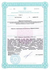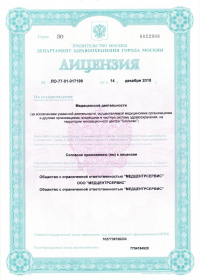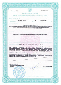 | Лицензии | 14.12.2018 Номер лицензии: ЛО-77-01-017199 Лицензируемый вид деятельности: Медицинская деятельность Дата внесения записи в реестр: 14.12.2018 Номер приказа о предоставлении лицензии: 965-Л Дата приказа о предоставлении лицензии: 14.12.2018 Адрес мест осуществления лицензируемого вида деятельности: 103064, г. Москва, ул. Земляной Вал, д. 38-40, стр. 6 18.10.2010 Номер лицензии: ЛО-77-01-003034 Лицензируемый вид деятельности: Медицинская деятельность Дата внесения записи в реестр: 18.10.2010 Номер приказа о предоставлении лицензии: 1840 Дата приказа о предоставлении лицензии: 18.10.2010 Адрес мест осуществления лицензируемого вида деятельности: 125047, г. Москва, ул. 1-я Тверская-Ямская, д.29/66, стр.1 09.08.2010 Номер лицензии: ЛО-77-01-002853 Лицензируемый вид деятельности: Медицинская деятельность Дата внесения записи в реестр: 09.08.2010 Номер приказа о предоставлении лицензии: 1240 Дата приказа о предоставлении лицензии: 09.08.2010 Адрес мест осуществления лицензируемого вида деятельности: 105064, г. Москва, Земляной Вал, д.38-40, стр.6 04.12.2009 Номер лицензии: ЛО-77-01-002016дубликат Лицензируемый вид деятельности: Медицинская деятельность Дата внесения записи в реестр: 04.12.2009 Номер приказа о предоставлении лицензии: 1601 Дата приказа о предоставлении лицензии: 04.12.2009 Адрес мест осуществления лицензируемого вида деятельности: 103064, г. Москва, ул. Земляной Вал, д. 38-40, стр. 6 04.10.2009 Номер лицензии: ЛО-77-01- 001566 Лицензируемый вид деятельности: Медицинская деятельность Дата внесения записи в реестр: 04.10.2009 Номер приказа о предоставлении лицензии: 1231 Дата приказа о предоставлении лицензии: 01.10.2009 Адрес мест осуществления лицензируемого вида деятельности: 27.08.2009 Номер лицензии: ЛО-77-01-001699дубликат Лицензируемый вид деятельности: Медицинская деятельность Дата внесения записи в реестр: 27.08.2009 Номер приказа о предоставлении лицензии: 1047 Дата приказа о предоставлении лицензии: 27.08.2009 Адрес мест осуществления лицензируемого вида деятельности: 103064, г. Москва, ул. Земляной Вал, д. 38-40, стр. 6 28.07.2009 Номер лицензии: ЛО-77-01-001612дубликат Лицензируемый вид деятельности: Медицинская деятельность Дата внесения записи в реестр: 28.07.2009 Номер приказа о предоставлении лицензии: 901 Дата приказа о предоставлении лицензии: 28.07.2009 Адрес мест осуществления лицензируемого вида деятельности: 125047, г. Москва, ул. 1-я Тверская-Ямская, д. 29/66, стр. 1 19.12.2008 Номер лицензии: ЛО-77-01-000864дубликат Лицензируемый вид деятельности: Медицинская деятельность Дата внесения записи в реестр: 19.12.2008 Номер приказа о предоставлении лицензии: 1079 Дата приказа о предоставлении лицензии: 19.12.2008 Адрес мест осуществления лицензируемого вида деятельности: 107045, г. Москва, Селиверстов пер., д. 8, стр. 1 04.12.2008 Номер лицензии: ЛО-77-01-000860дубликат Лицензируемый вид деятельности: Медицинская деятельность Дата внесения записи в реестр: 04.12.2008 Номер приказа о предоставлении лицензии: 1024 Дата приказа о предоставлении лицензии: 04.12.2008 Адрес мест осуществления лицензируемого вида деятельности: 103045, г. Москва, Селиверстов пер., д. 8, стр. 1 04.12.2008 Номер лицензии: ЛО-77-01-000861дубликат Лицензируемый вид деятельности: Медицинская деятельность Дата внесения записи в реестр: 04.12.2008 Номер приказа о предоставлении лицензии: 1024 Дата приказа о предоставлении лицензии: 04.12.2008 Адрес мест осуществления лицензируемого вида деятельности: 103064, г. Москва, ул. Земляной Вал, д. 38-40, стр. 6 |
