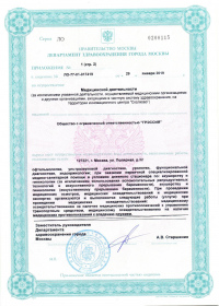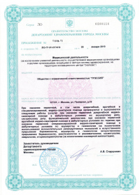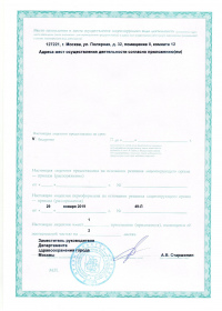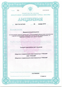| Лицензии | 14.12.2018 Номер лицензии: ЛО-77-01-017199 Лицензируемый вид деятельности: Медицинская деятельность Дата внесения записи в реестр: 14.12.2018 Номер приказа о предоставлении лицензии: 965-Л Дата приказа о предоставлении лицензии: 14.12.2018 Адрес мест осуществления лицензируемого вида деятельности: 103064, г. Москва, ул. Земляной Вал, д. 38-40, стр. 6 18.10.2010 Номер лицензии: ЛО-77-01-003034 Лицензируемый вид деятельности: Медицинская деятельность Дата внесения записи в реестр: 18.10.2010 Номер приказа о предоставлении лицензии: 1840 Дата приказа о предоставлении лицензии: 18.10.2010 Адрес мест осуществления лицензируемого вида деятельности: 125047, г. Москва, ул. 1-я Тверская-Ямская, д.29/66, стр.1 09.08.2010 Номер лицензии: ЛО-77-01-002853 Лицензируемый вид деятельности: Медицинская деятельность Дата внесения записи в реестр: 09.08.2010 Номер приказа о предоставлении лицензии: 1240 Дата приказа о предоставлении лицензии: 09.08.2010 Адрес мест осуществления лицензируемого вида деятельности: 105064, г. Москва, Земляной Вал, д.38-40, стр.6 04.12.2009 Номер лицензии: ЛО-77-01-002016дубликат Лицензируемый вид деятельности: Медицинская деятельность Дата внесения записи в реестр: 04.12.2009 Номер приказа о предоставлении лицензии: 1601 Дата приказа о предоставлении лицензии: 04.12.2009 Адрес мест осуществления лицензируемого вида деятельности: 103064, г. Москва, ул. Земляной Вал, д. 38-40, стр. 6 04.10.2009 Номер лицензии: ЛО-77-01- 001566 Лицензируемый вид деятельности: Медицинская деятельность Дата внесения записи в реестр: 04.10.2009 Номер приказа о предоставлении лицензии: 1231 Дата приказа о предоставлении лицензии: 01.10.2009 Адрес мест осуществления лицензируемого вида деятельности: 27.08.2009 Номер лицензии: ЛО-77-01-001699дубликат Лицензируемый вид деятельности: Медицинская деятельность Дата внесения записи в реестр: 27.08.2009 Номер приказа о предоставлении лицензии: 1047 Дата приказа о предоставлении лицензии: 27.08.2009 Адрес мест осуществления лицензируемого вида деятельности: 103064, г. Москва, ул. Земляной Вал, д. 38-40, стр. 6 28.07.2009 Номер лицензии: ЛО-77-01-001612дубликат Лицензируемый вид деятельности: Медицинская деятельность Дата внесения записи в реестр: 28.07.2009 Номер приказа о предоставлении лицензии: 901 Дата приказа о предоставлении лицензии: 28.07.2009 Адрес мест осуществления лицензируемого вида деятельности: 125047, г. Москва, ул. 1-я Тверская-Ямская, д. 29/66, стр. 1 19.12.2008 Номер лицензии: ЛО-77-01-000864дубликат Лицензируемый вид деятельности: Медицинская деятельность Дата внесения записи в реестр: 19.12.2008 Номер приказа о предоставлении лицензии: 1079 Дата приказа о предоставлении лицензии: 19.12.2008 Адрес мест осуществления лицензируемого вида деятельности: 107045, г. Москва, Селиверстов пер., д. 8, стр. 1 04.12.2008 Номер лицензии: ЛО-77-01-000860дубликат Лицензируемый вид деятельности: Медицинская деятельность Дата внесения записи в реестр: 04.12.2008 Номер приказа о предоставлении лицензии: 1024 Дата приказа о предоставлении лицензии: 04.12.2008 Адрес мест осуществления лицензируемого вида деятельности: 103045, г. Москва, Селиверстов пер., д. 8, стр. 1 04.12.2008 Номер лицензии: ЛО-77-01-000861дубликат Лицензируемый вид деятельности: Медицинская деятельность Дата внесения записи в реестр: 04.12.2008 Номер приказа о предоставлении лицензии: 1024 Дата приказа о предоставлении лицензии: 04.12.2008 Адрес мест осуществления лицензируемого вида деятельности: 103064, г. Москва, ул. Земляной Вал, д. 38-40, стр. 6 |