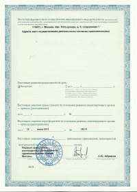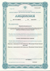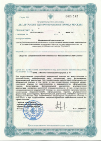 | Лицензии | 16.12.2013 Номер лицензии: ЛО-77-03-000163 Лицензируемый вид деятельности: Деятельность по обороту наркотических средств, психотропных веществ и их прекурсоров, культивированию наркосодержащих растений Дата внесения записи в реестр: 16.12.2013 Номер приказа о предоставлении лицензии: 702-Л Дата приказа о предоставлении лицензии: 16.12.2013 Адрес мест осуществления лицензируемого вида деятельности: 119146, г. Москва, Семеновский переулок, д. 11 25.07.2013 Номер лицензии: ЛО-77-01-006353 Лицензируемый вид деятельности: Медицинская деятельность Дата внесения записи в реестр: 25.07.2013 Номер приказа о предоставлении лицензии: 383-Л Дата приказа о предоставлении лицензии: 25.07.2013 Адрес мест осуществления лицензируемого вида деятельности: 119146, г. Москва, Семеновский переулок, д. 11 |