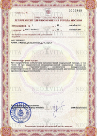 | Лицензии | 02.05.2017 Номер лицензии: ЛО-77-01-014233 Лицензируемый вид деятельности: Медицинская деятельность Дата внесения записи в реестр: 02.05.2017 Номер приказа о предоставлении лицензии: 255-Л Дата приказа о предоставлении лицензии: 02.05.2017 Адрес мест осуществления лицензируемого вида деятельности: 121609, г. Москва, ул.Крылатская, д. 45, корп.1 |