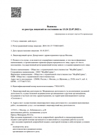 | Лицензии | 18.10.2017 Номер лицензии: ЛО-77-01-015035 Лицензируемый вид деятельности: Медицинская деятельность Дата внесения записи в реестр: 18.10.2017 Номер приказа о предоставлении лицензии: 05-05-636-Л Дата приказа о предоставлении лицензии: 18.10.2017 Адрес мест осуществления лицензируемого вида деятельности: 117415, г. Москва, ул. Лобачевского, д.20 12.05.2017 Номер лицензии: ЛО-77-03-000690 Лицензируемый вид деятельности: Деятельность по обороту наркотических средств, психотропных веществ и их прекурсоров, культивированию наркосодержащих растений Дата внесения записи в реестр: 12.05.2017 Номер приказа о предоставлении лицензии: 281-Л Дата приказа о предоставлении лицензии: 12.05.2017 Адрес мест осуществления лицензируемого вида деятельности: 119048, г. Москва, ул. Усачева, д. 33, стр. 4 04.05.2017 Номер лицензии: ЛО-77-02-008527 Лицензируемый вид деятельности: Фармацевтическая деятельность Дата внесения записи в реестр: 04.05.2017 Номер приказа о предоставлении лицензии: 265-Л Дата приказа о предоставлении лицензии: 04.05.2017 Адрес мест осуществления лицензируемого вида деятельности: 119048, г. Москва, ул. Усачева, д. 33, стр. 4 04.05.2017 Номер лицензии: ЛО-77-02-008528 Лицензируемый вид деятельности: Фармацевтическая деятельность Дата внесения записи в реестр: 04.05.2017 Номер приказа о предоставлении лицензии: 265-Л Дата приказа о предоставлении лицензии: 04.05.2017 Адрес мест осуществления лицензируемого вида деятельности: 117415, г. Москва, ул. Лобачевского, д.20 |